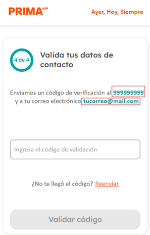 - Asegúrate de que el correo electrónico y el número de celular ingresados sean correctos ya que más adelante recibirás un código OTP (One-Time Password) que utilizarás para validar tu identidad.